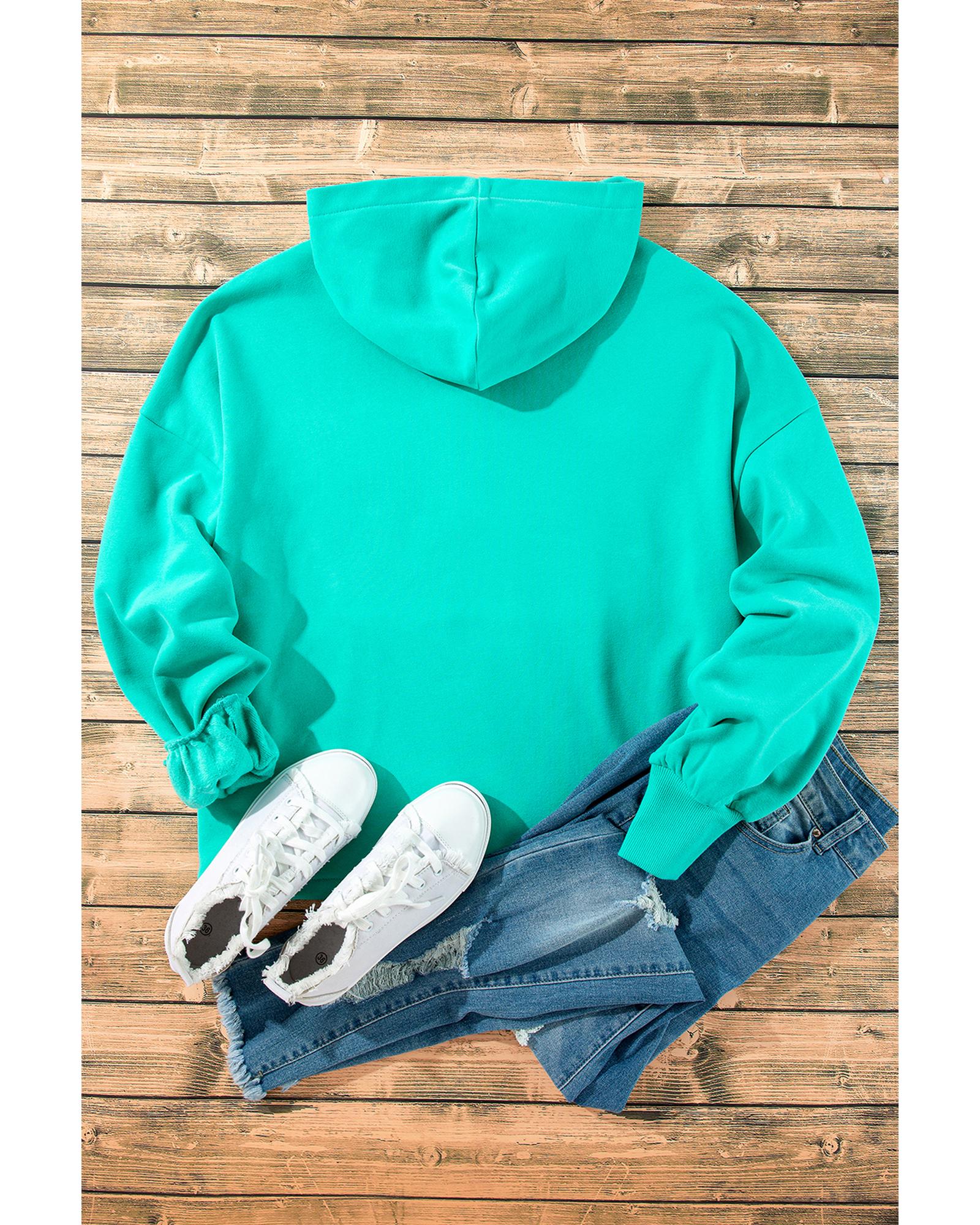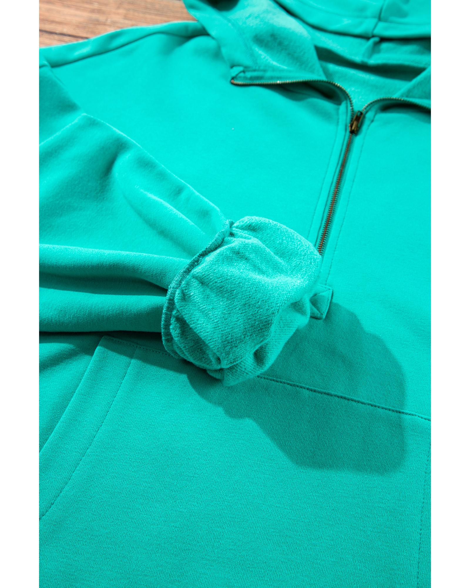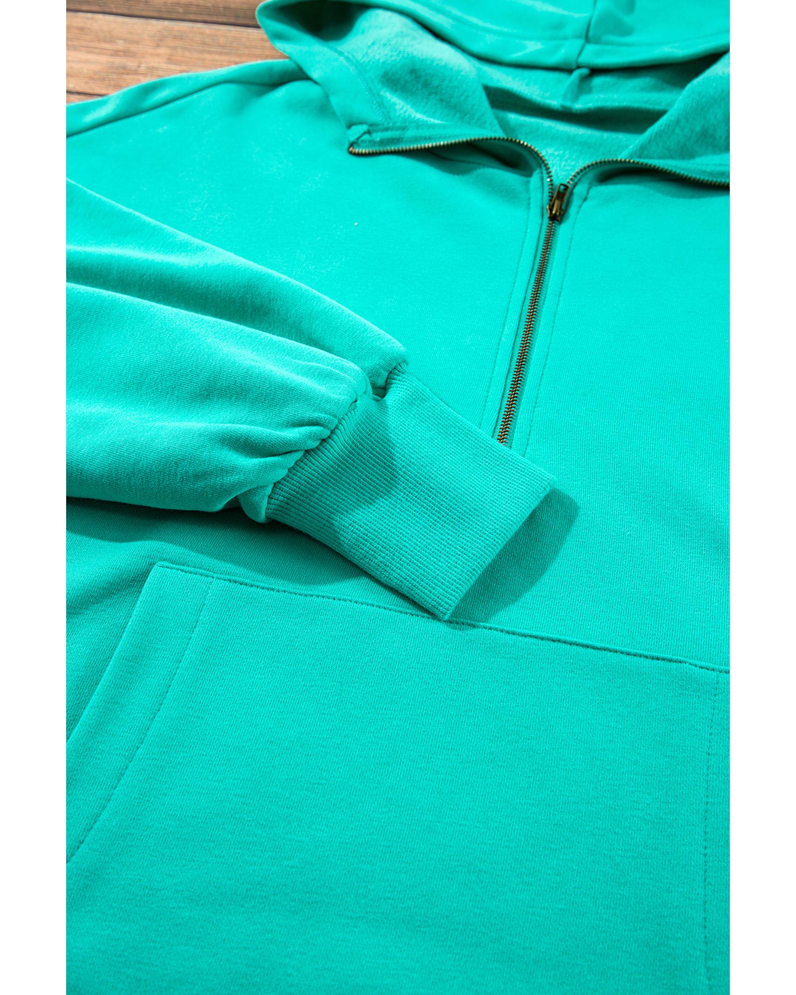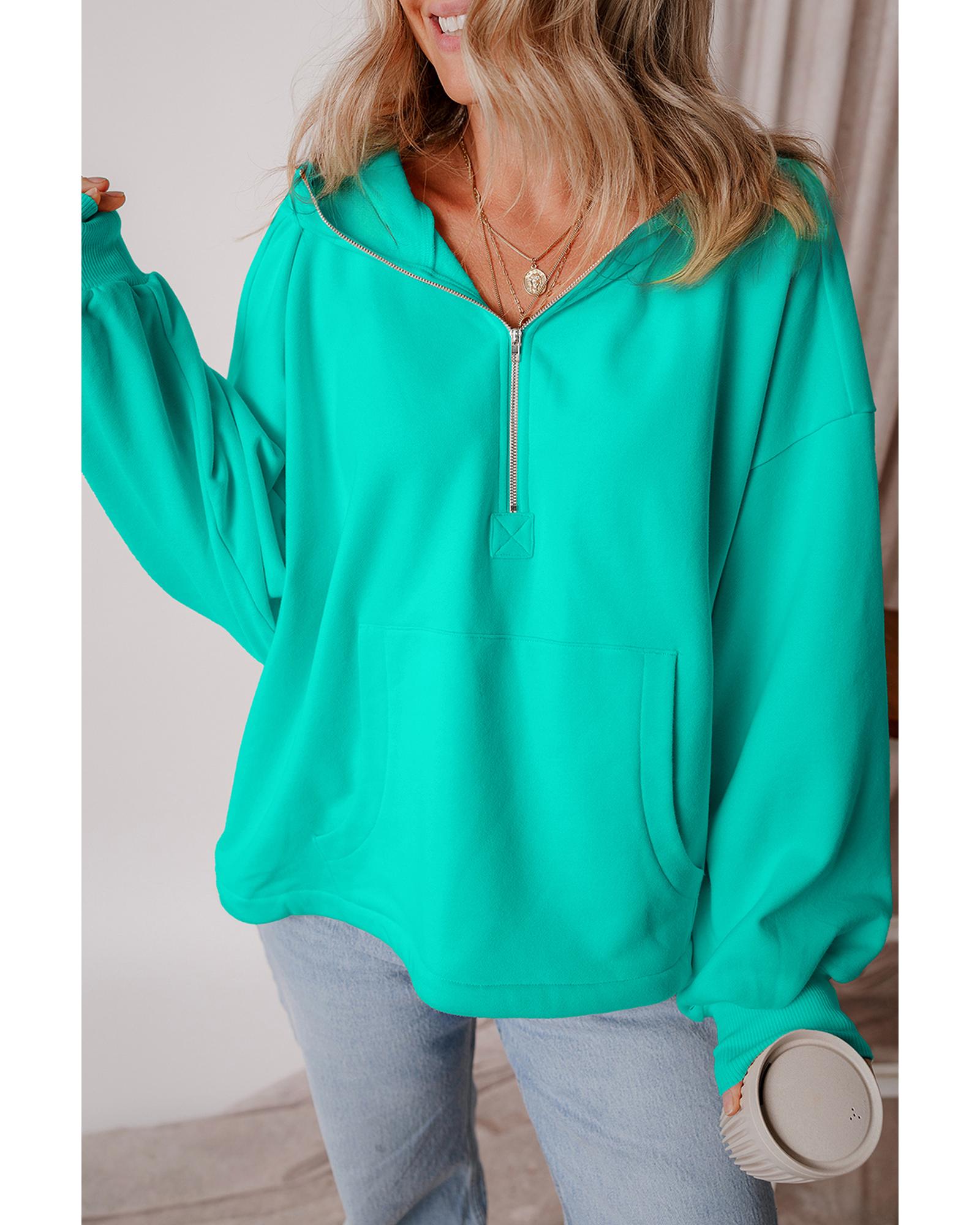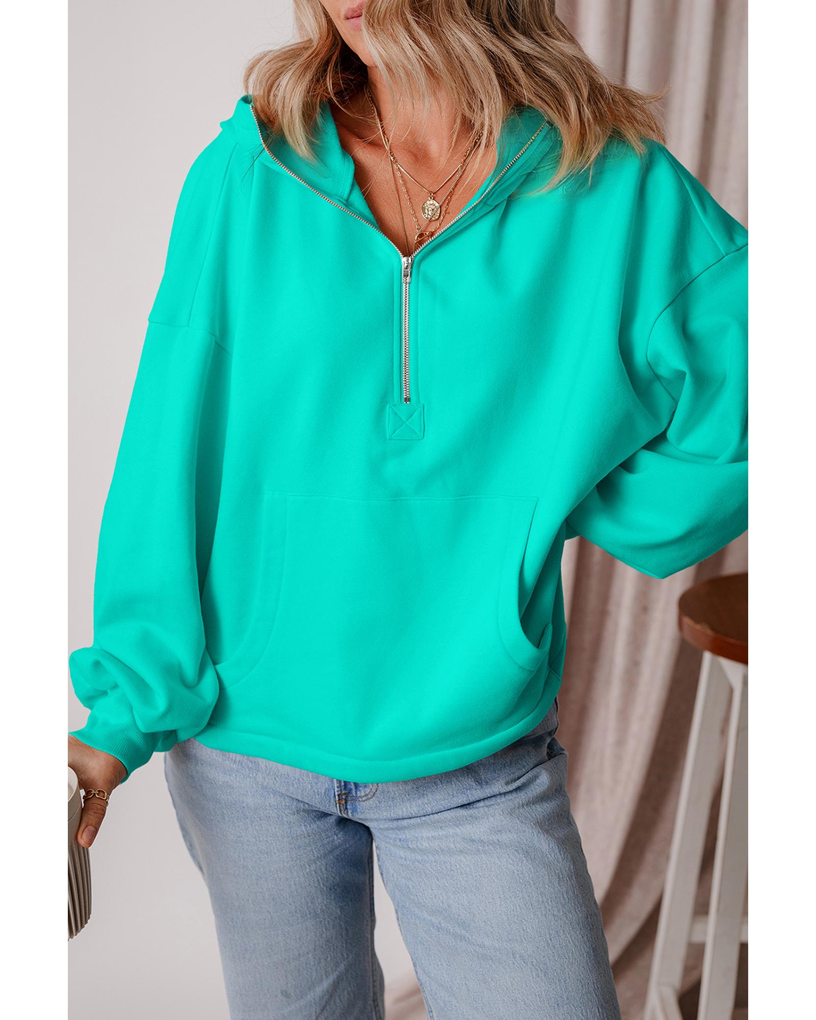 - Aruba Blue Fleece Lined Half Zipper Kangaroo Pockets Loose Hoodie