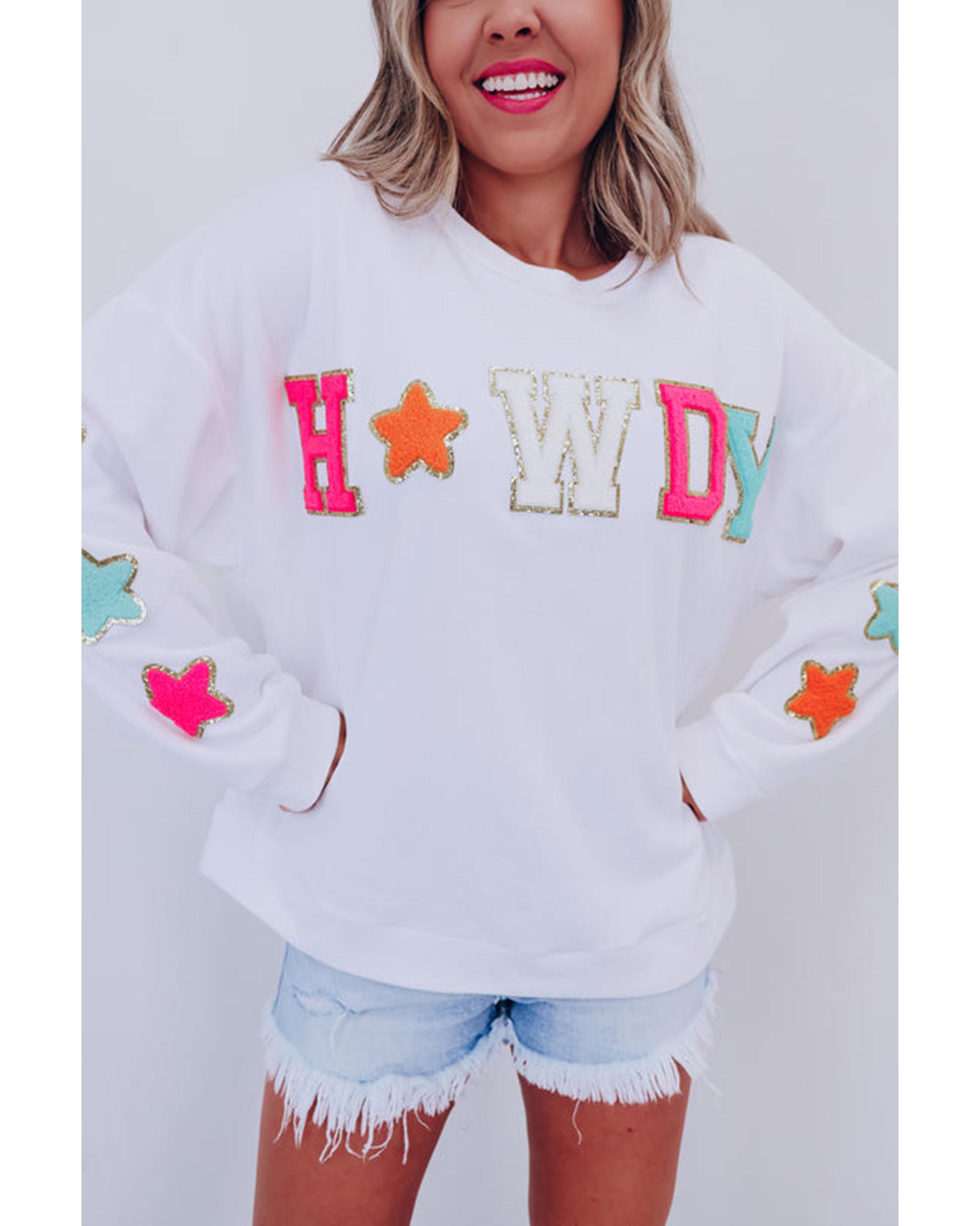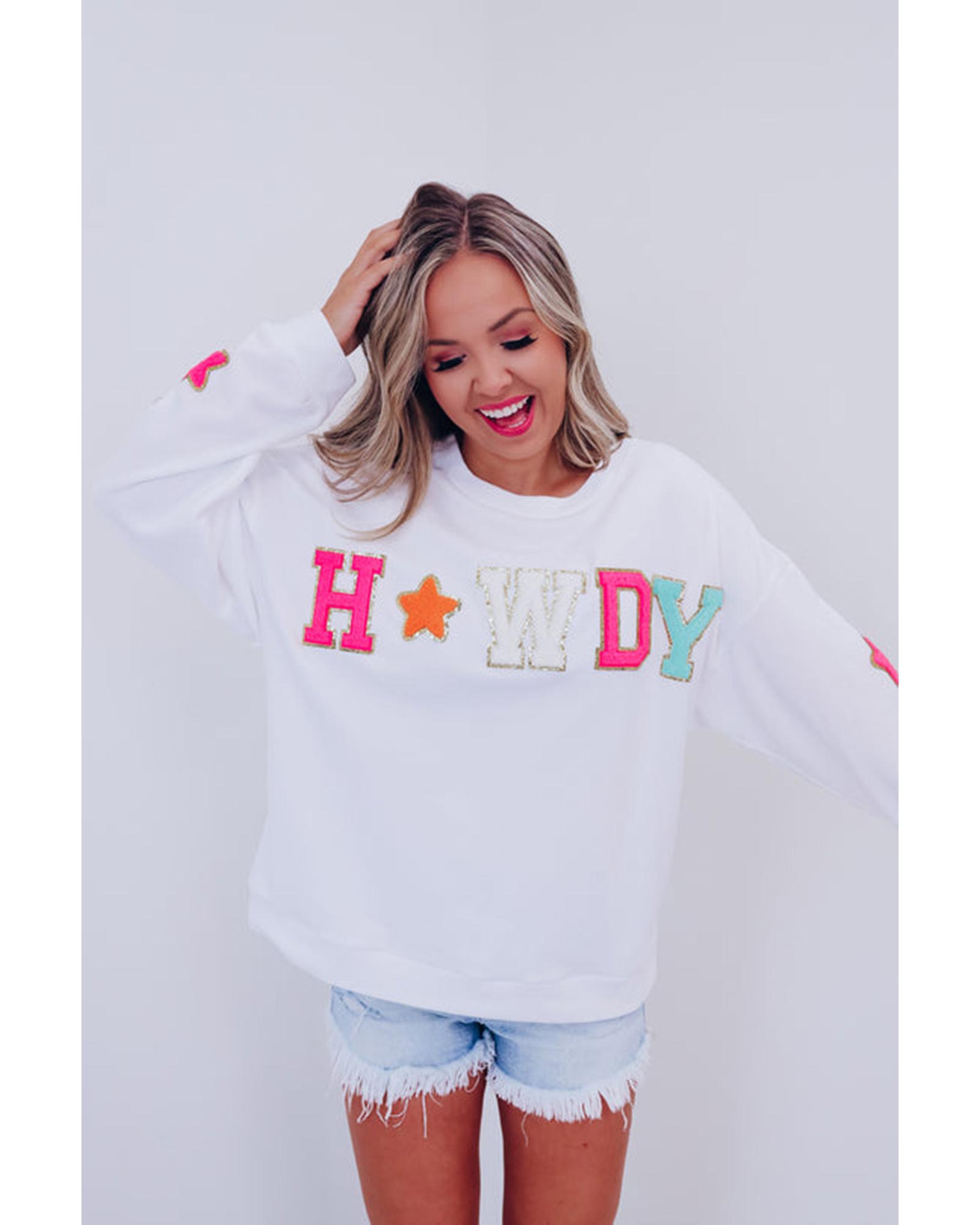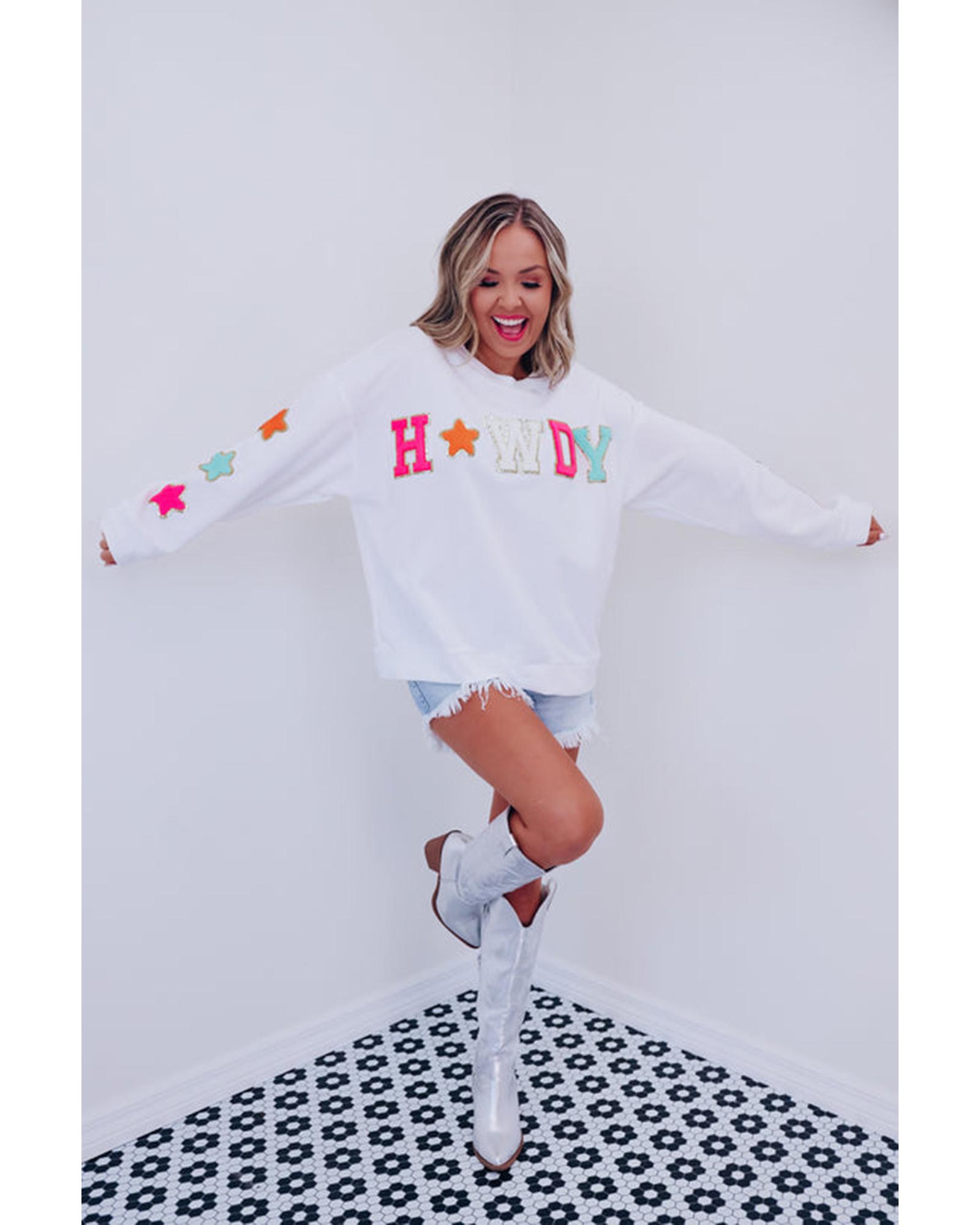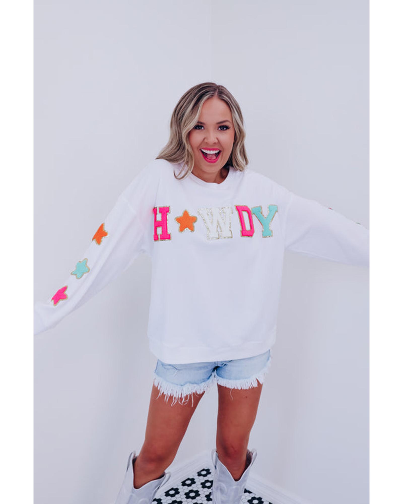 - Fashionable twist to your wardrobe Glittering HOWDY graphic for a touch of glam Star patterns on the sleeves for a cute and childlike feel Perfect for school shopping or trips Versatile graphic sweatshirt