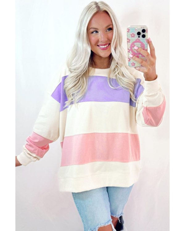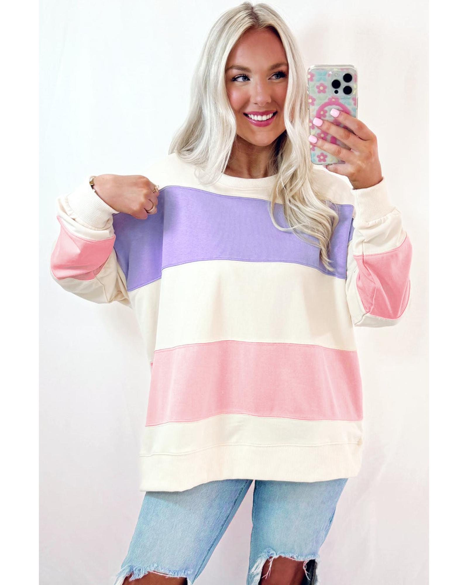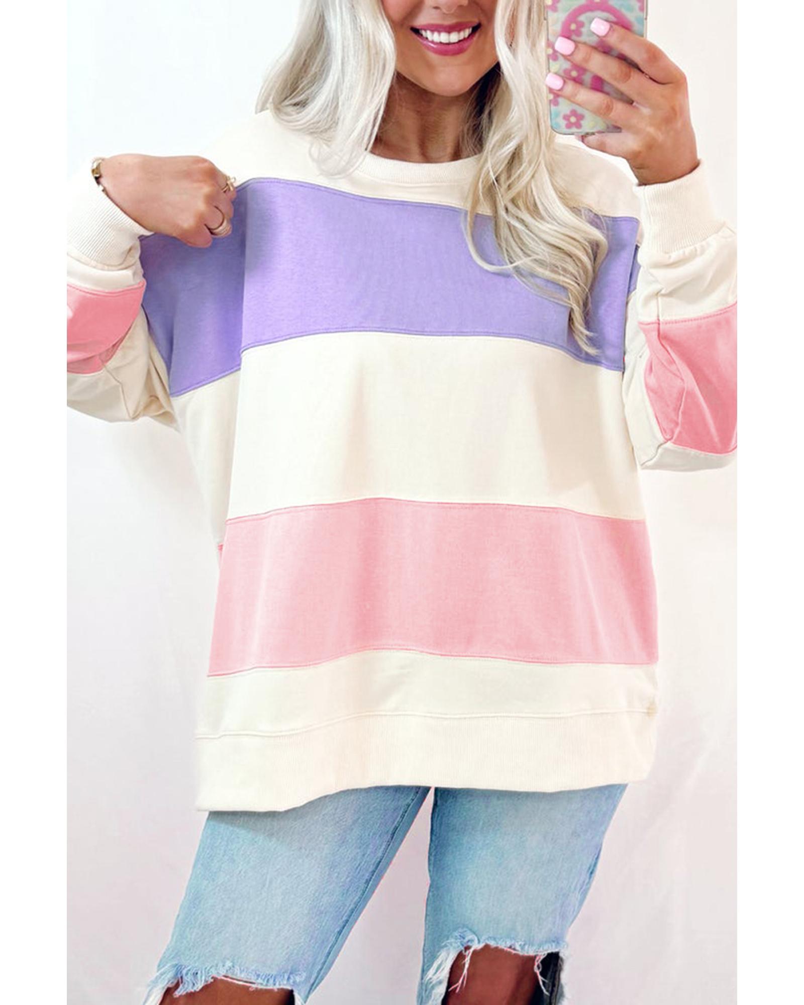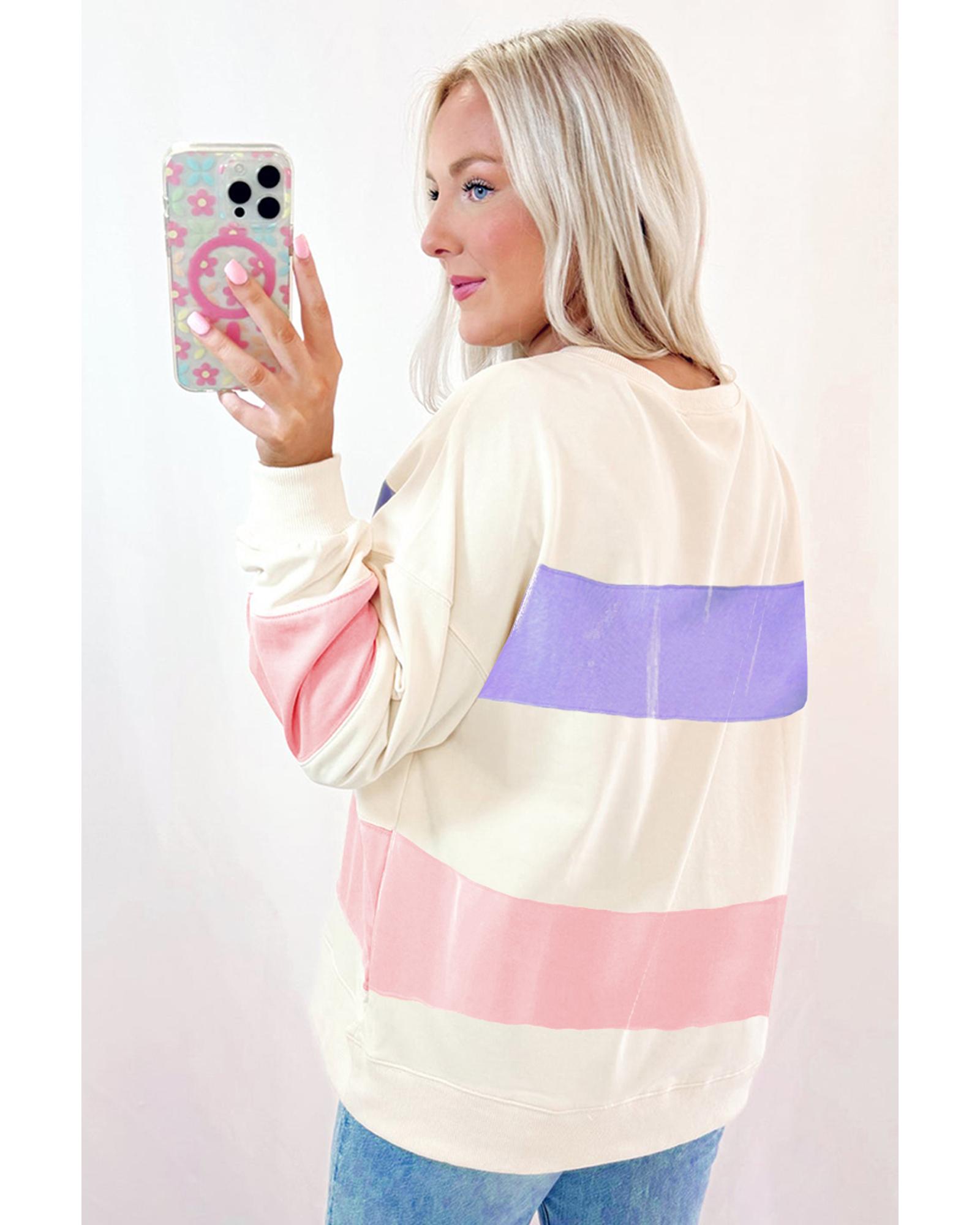 Beige Colorblock Patchwork Drop Shoulder Crewneck Sweatshirt