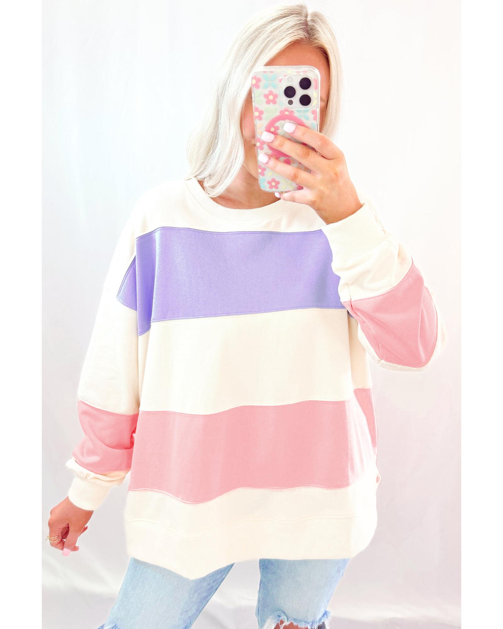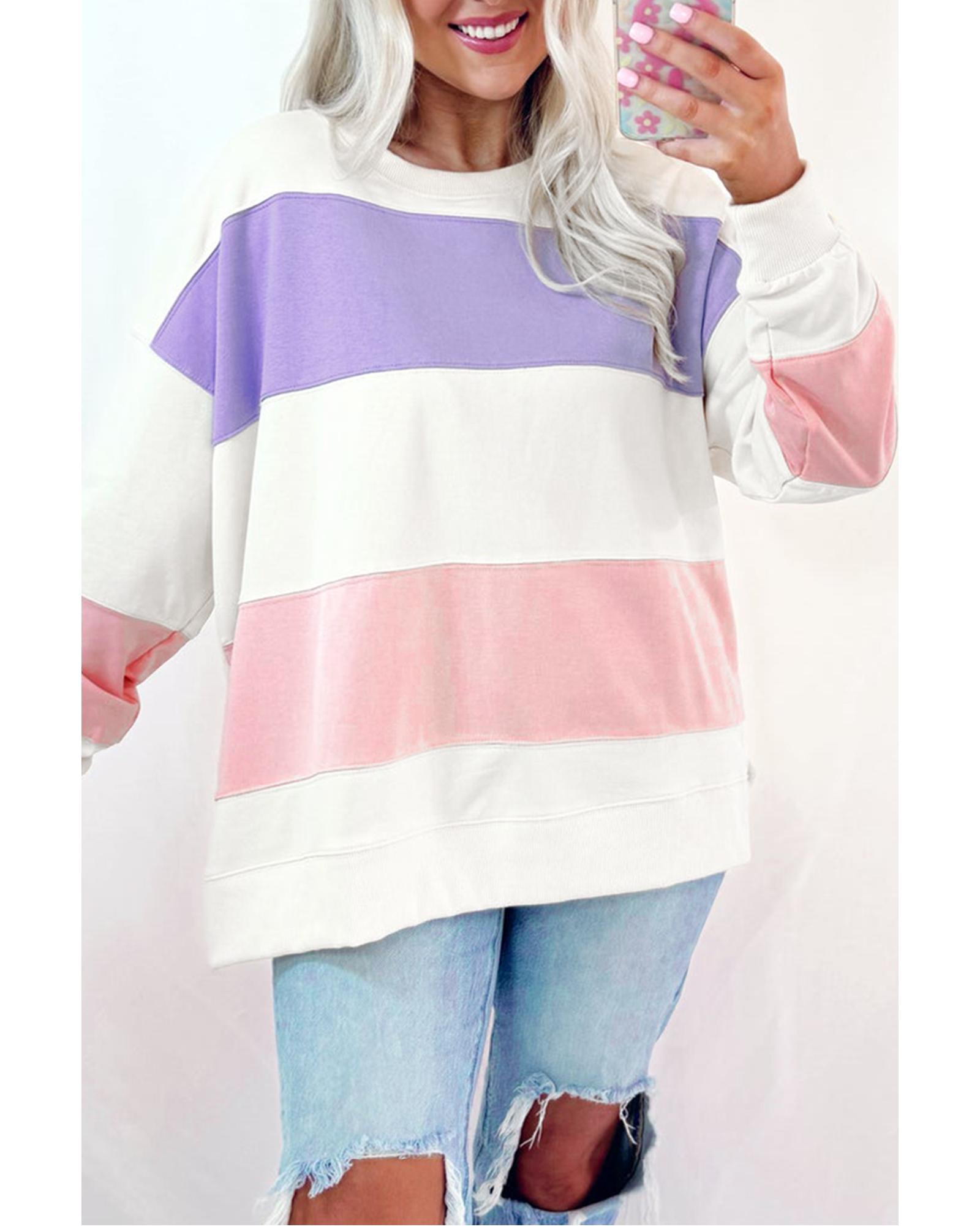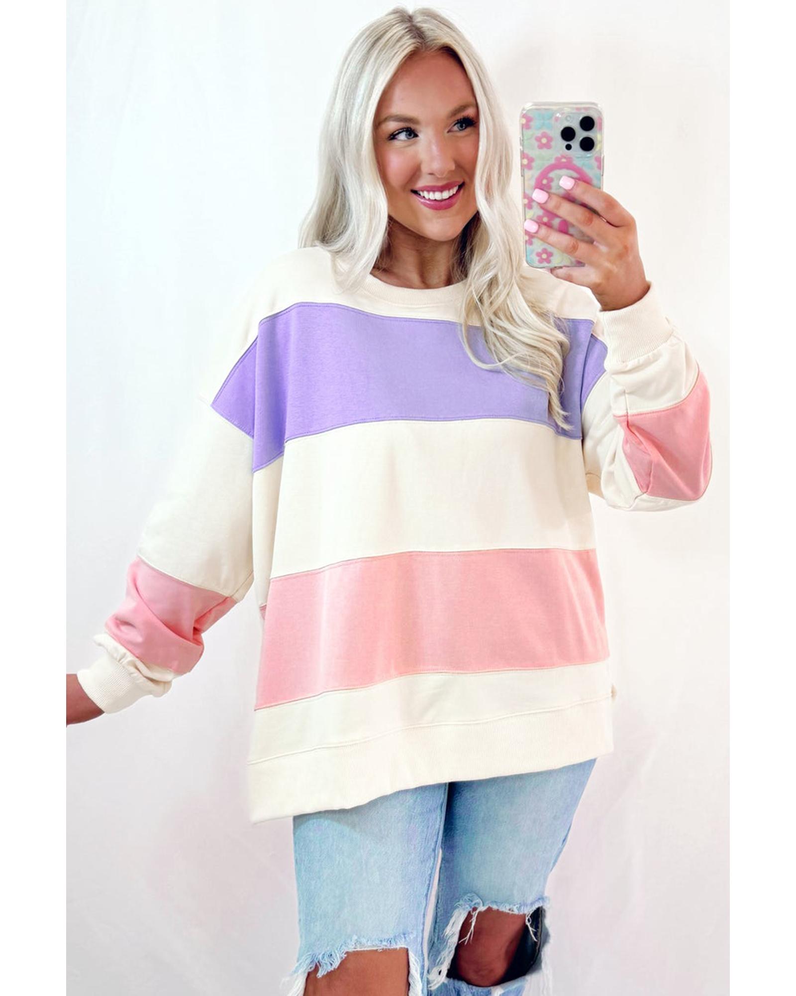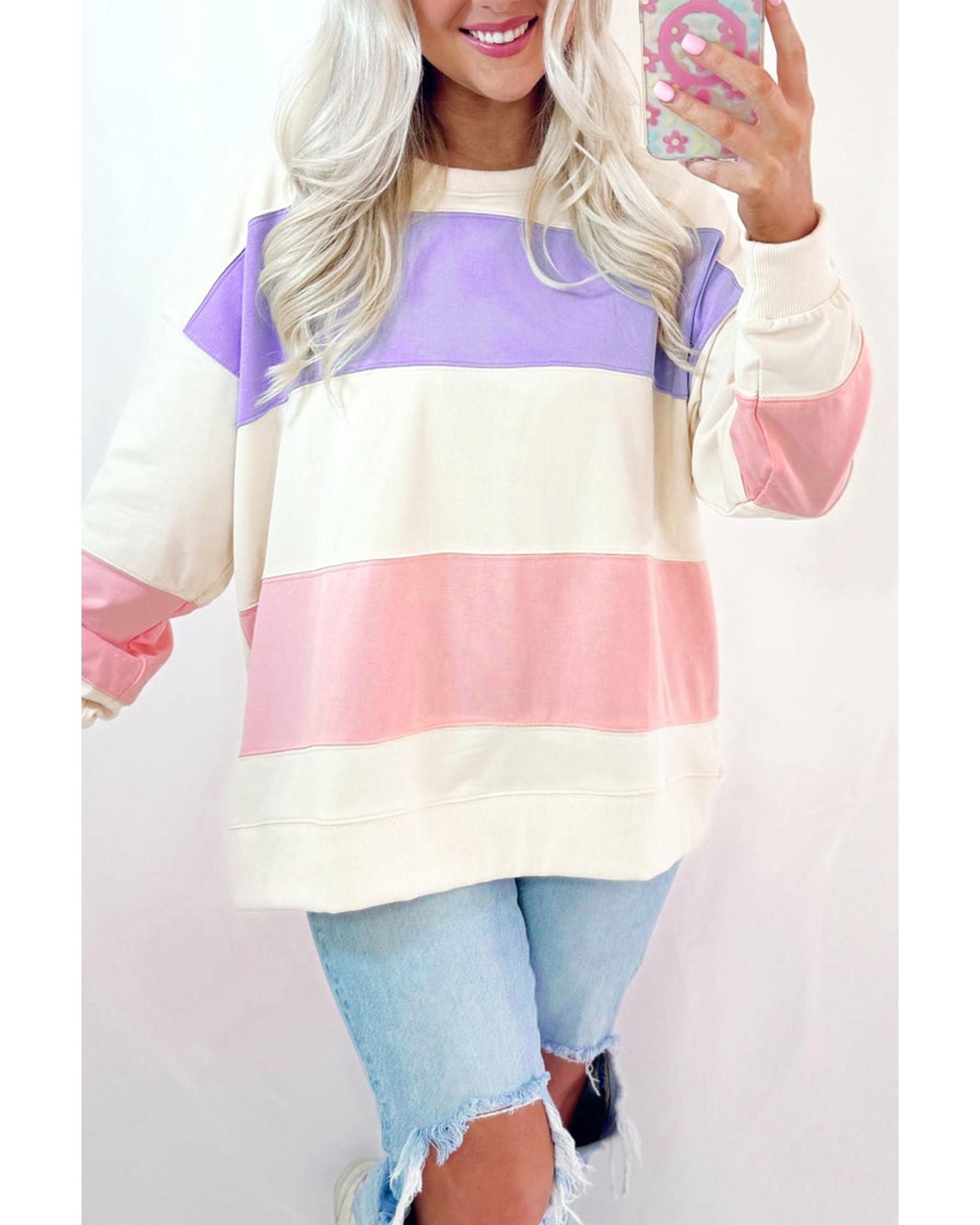 Beige Colorblock Patchwork Drop Shoulder Crewneck Sweatshirt