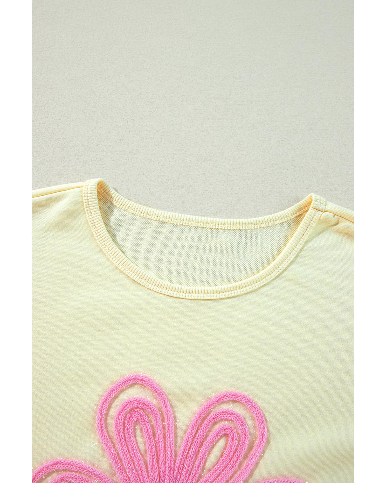 • Beige Tinsel Flower Dropped Puff Sleeve Sweatshirt