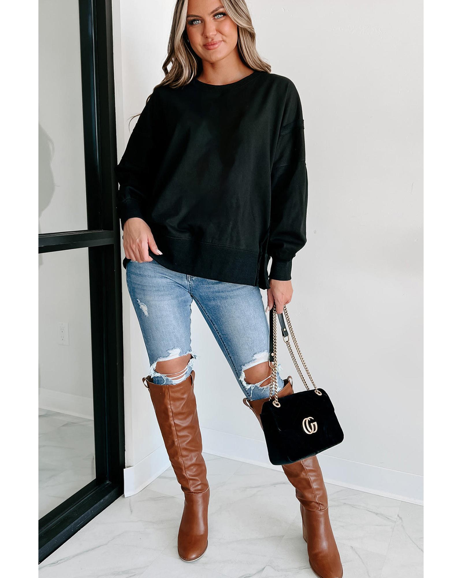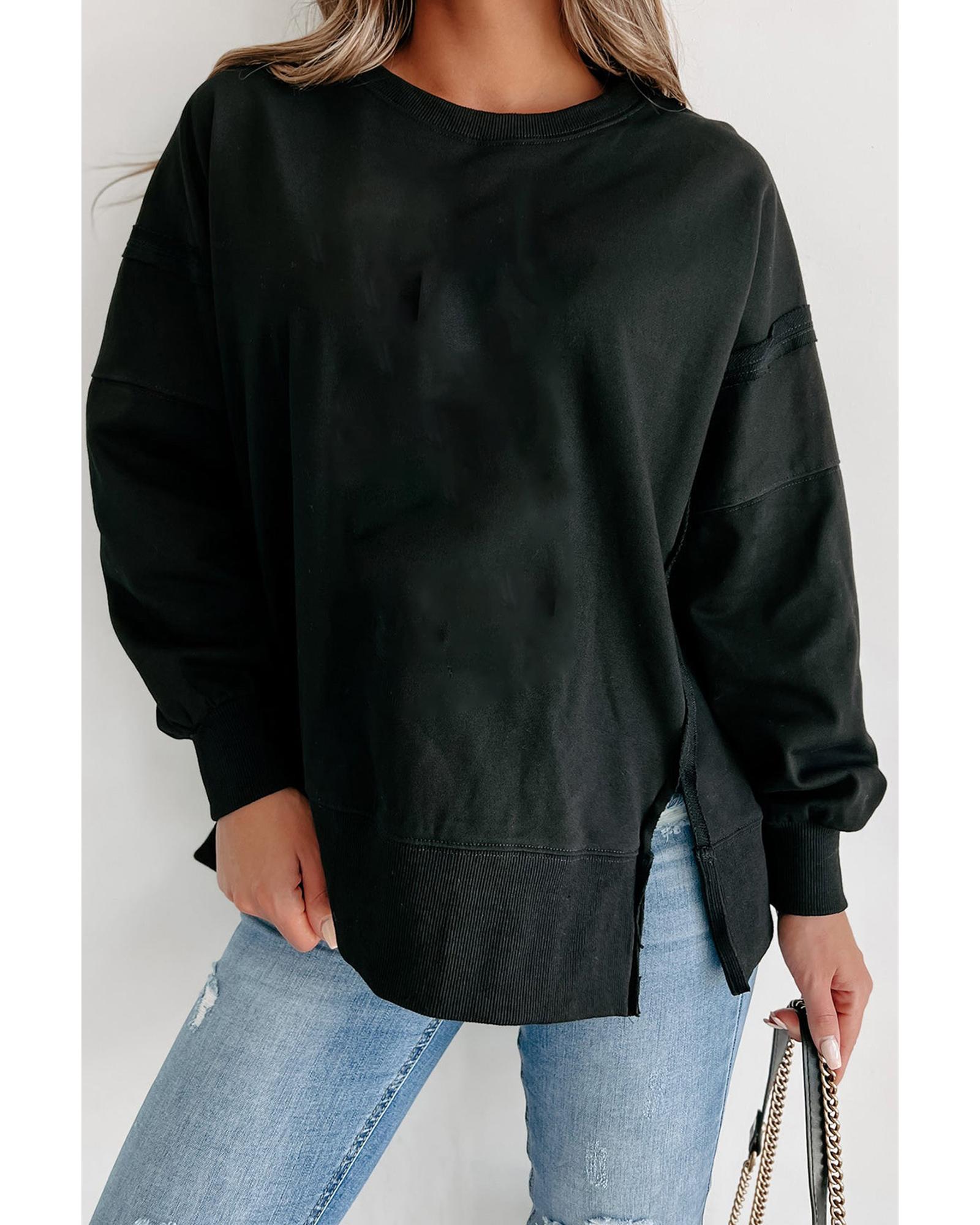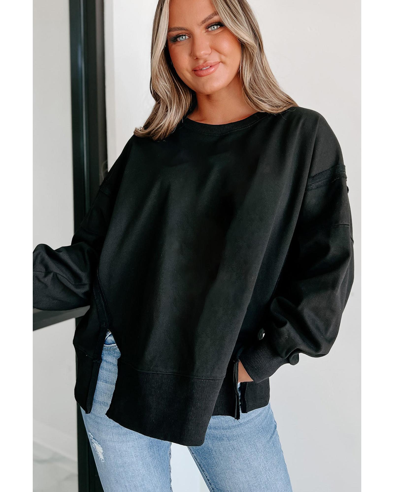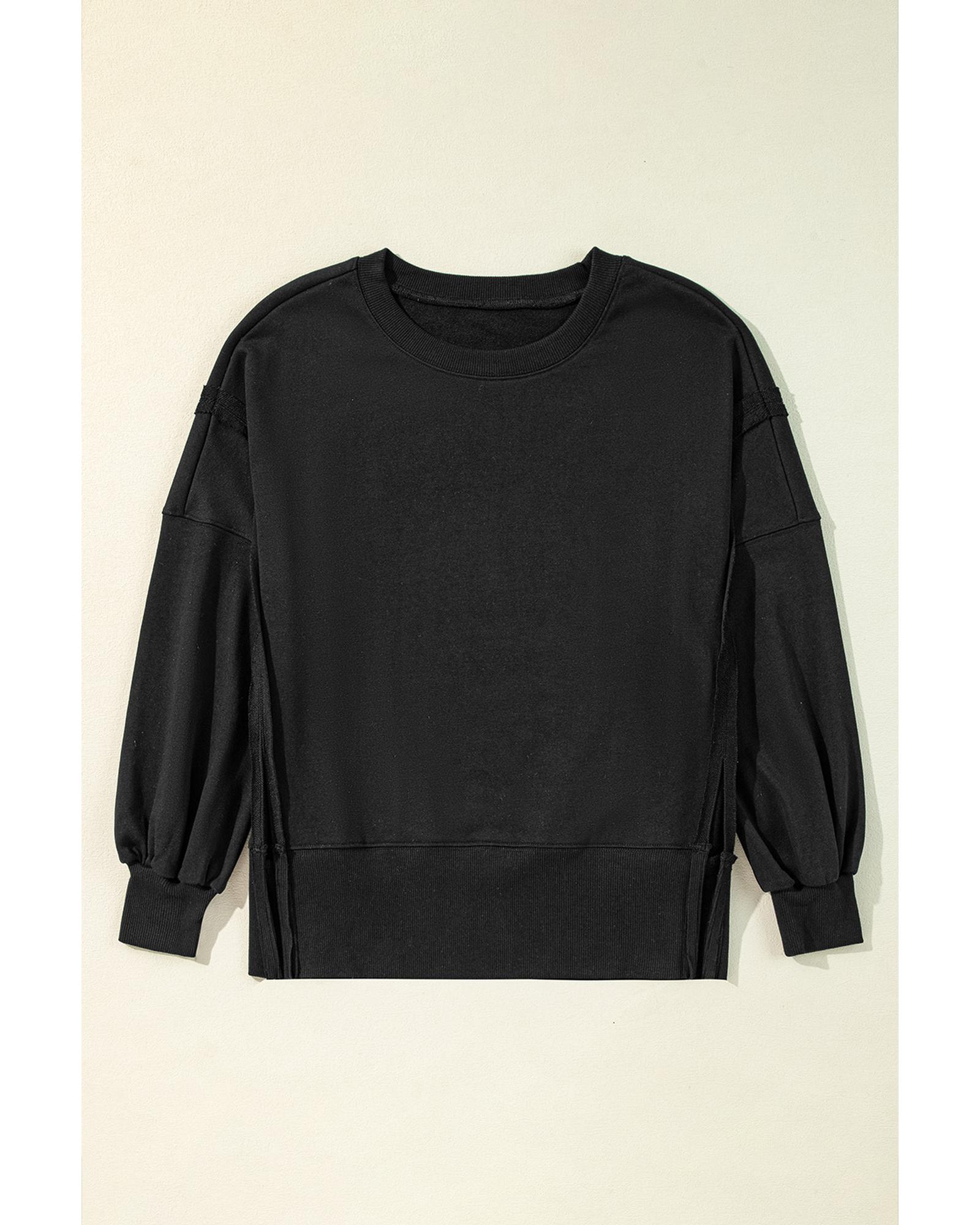 Black Exposed Seam Drop Shoulder Round Neck Sweatshirt with Slits