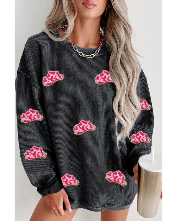 - Black Glittering Cowboy Hat Patched Corded Pullover Sweatshirt
