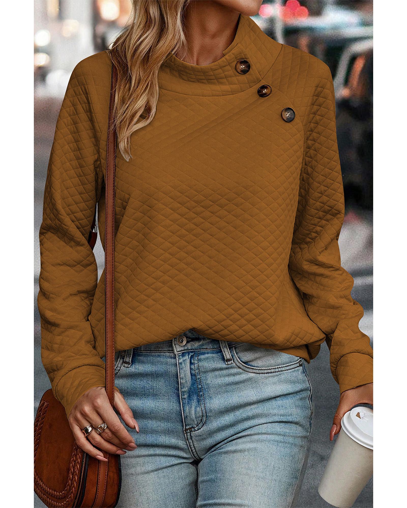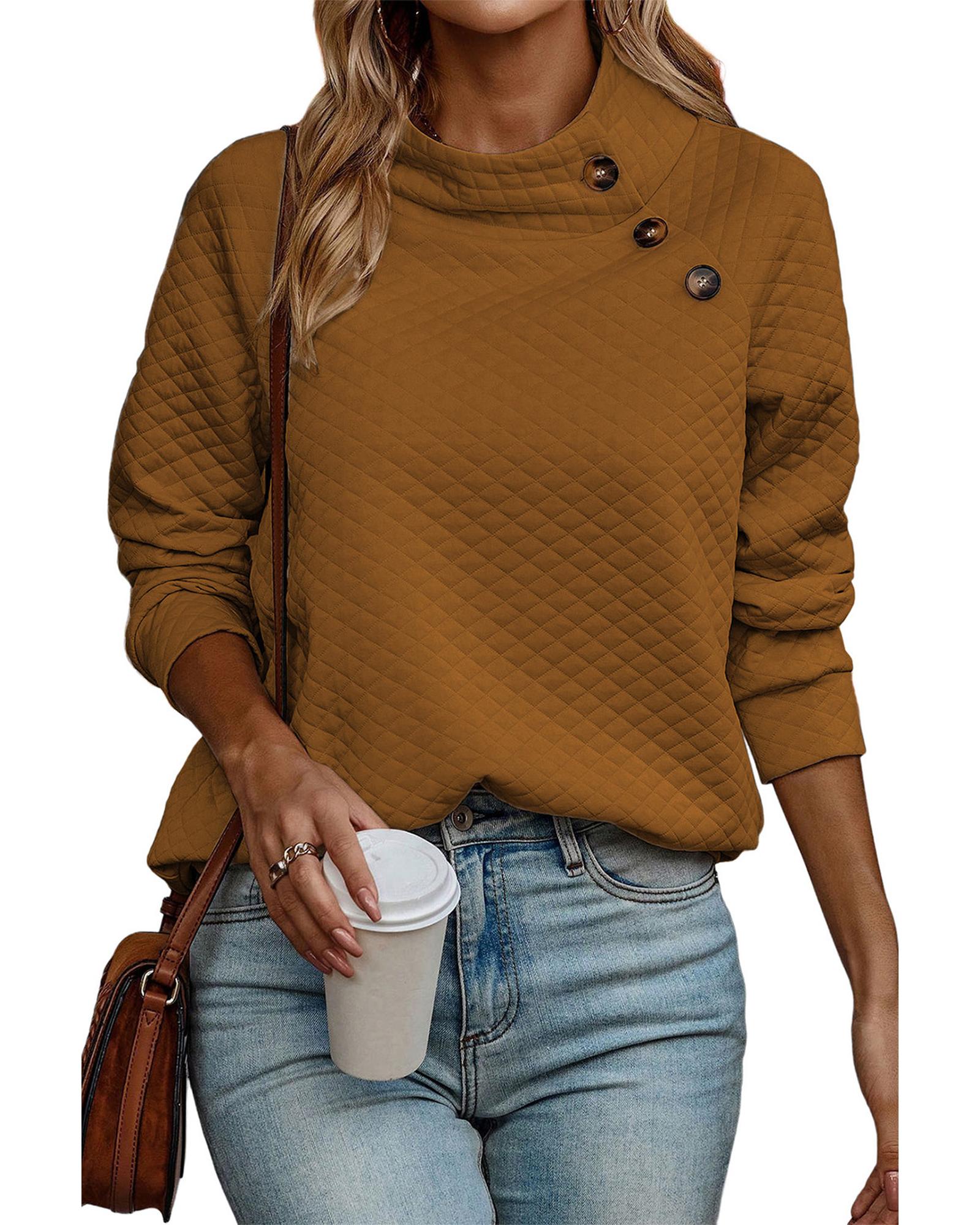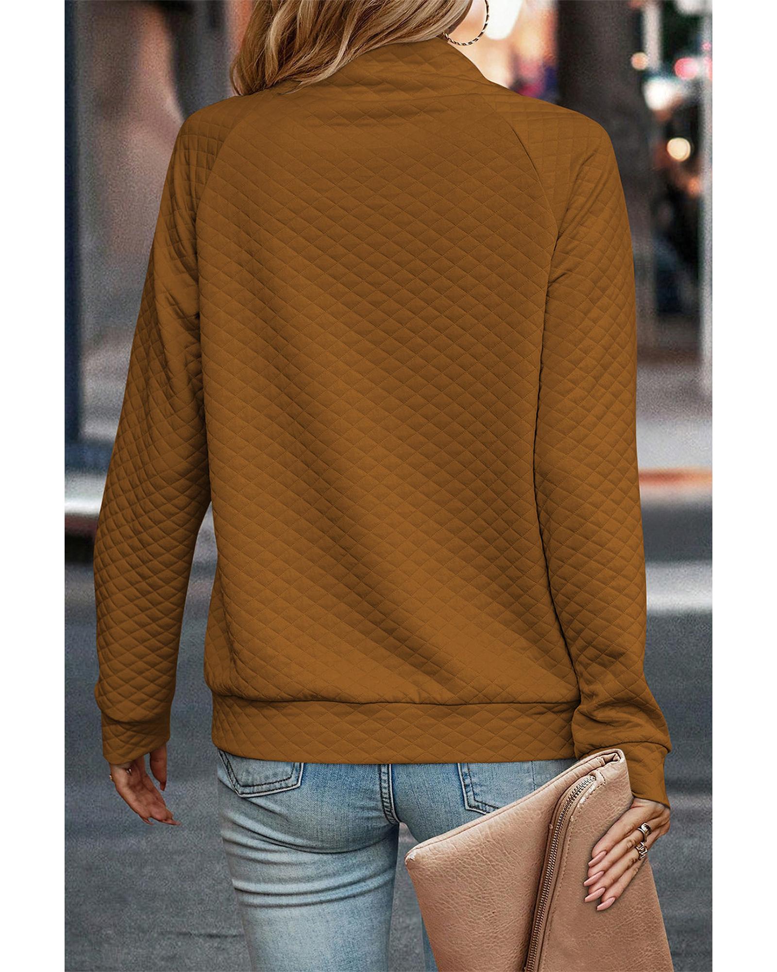 Chestnut Quilted Buttoned Neckline Stand Neck Pullover Sweatshirt
