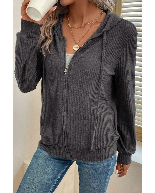 • Dark Grey Ribbed Zip Up Front Drawstring Hoodie