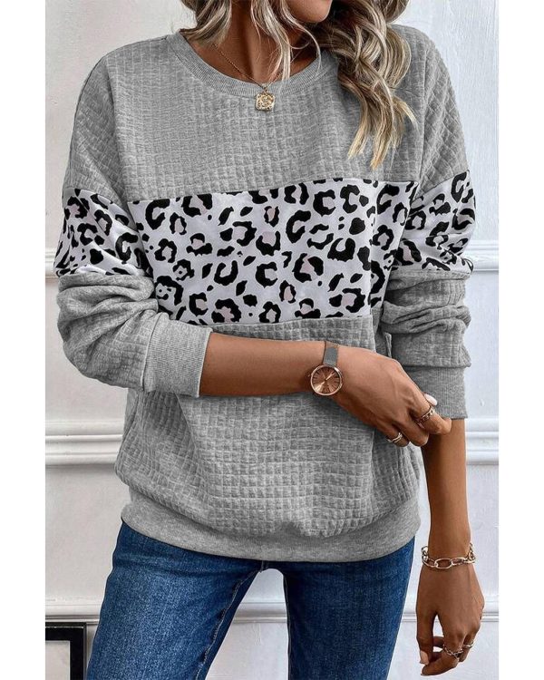 Gray Leopard Quilted Patchwork Crew Neck Sweatshirt