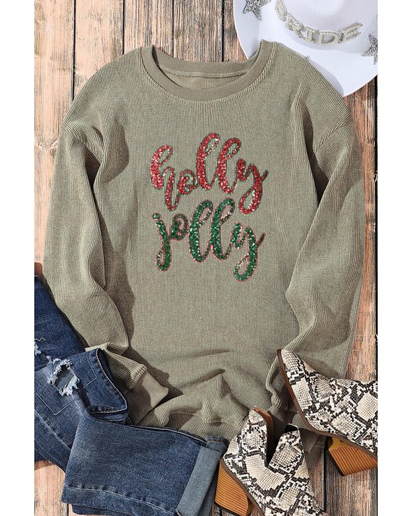 • Green Sequined Holly Jolly Graphic Corded Sweatshirt
