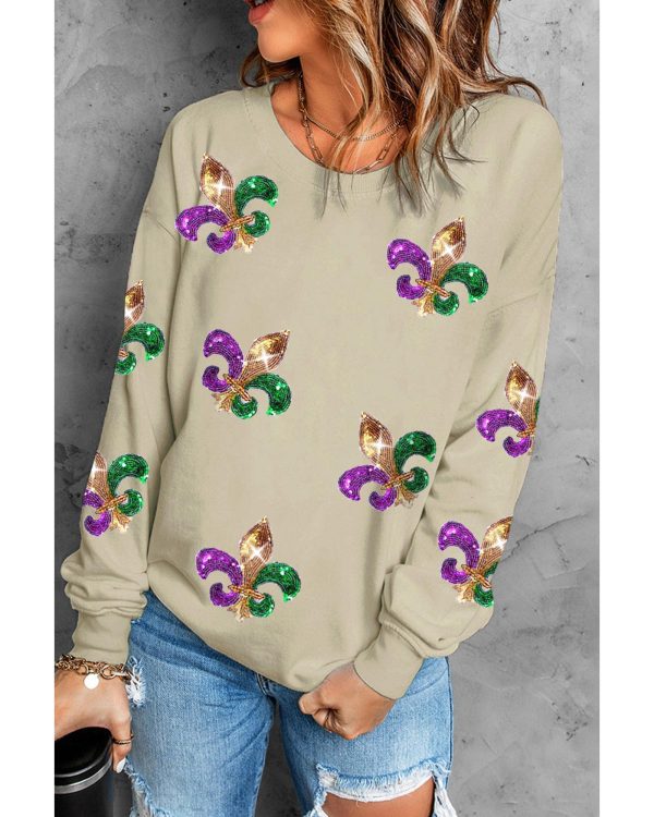 Khaki Sequin Mardi Gras Graphic Pullover Sweatshirt