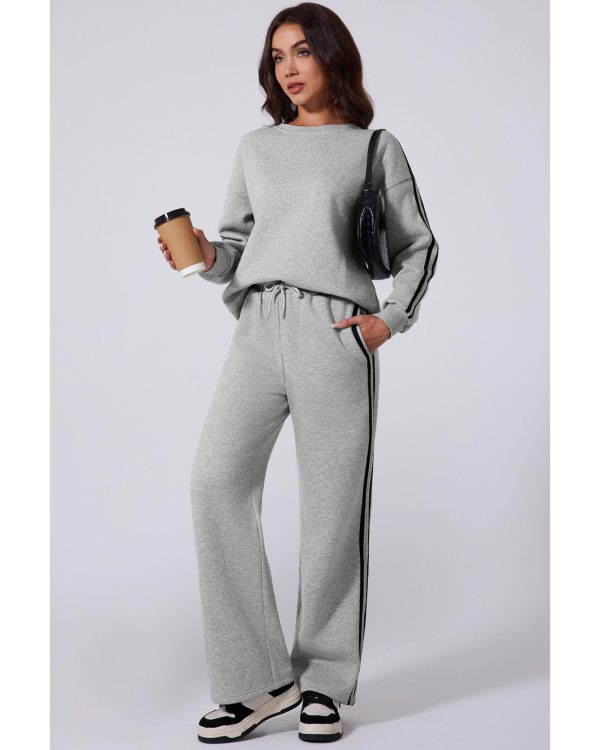 - Light Grey Solid Color Side Striped Sweatshirt Active Set