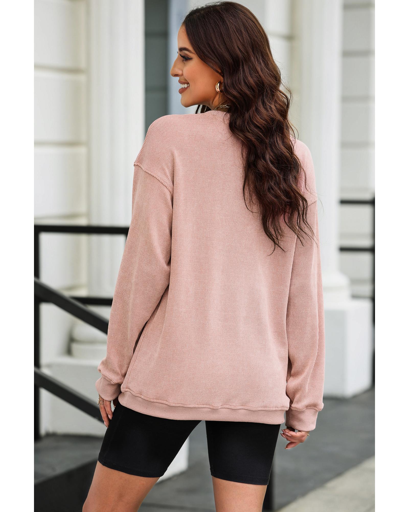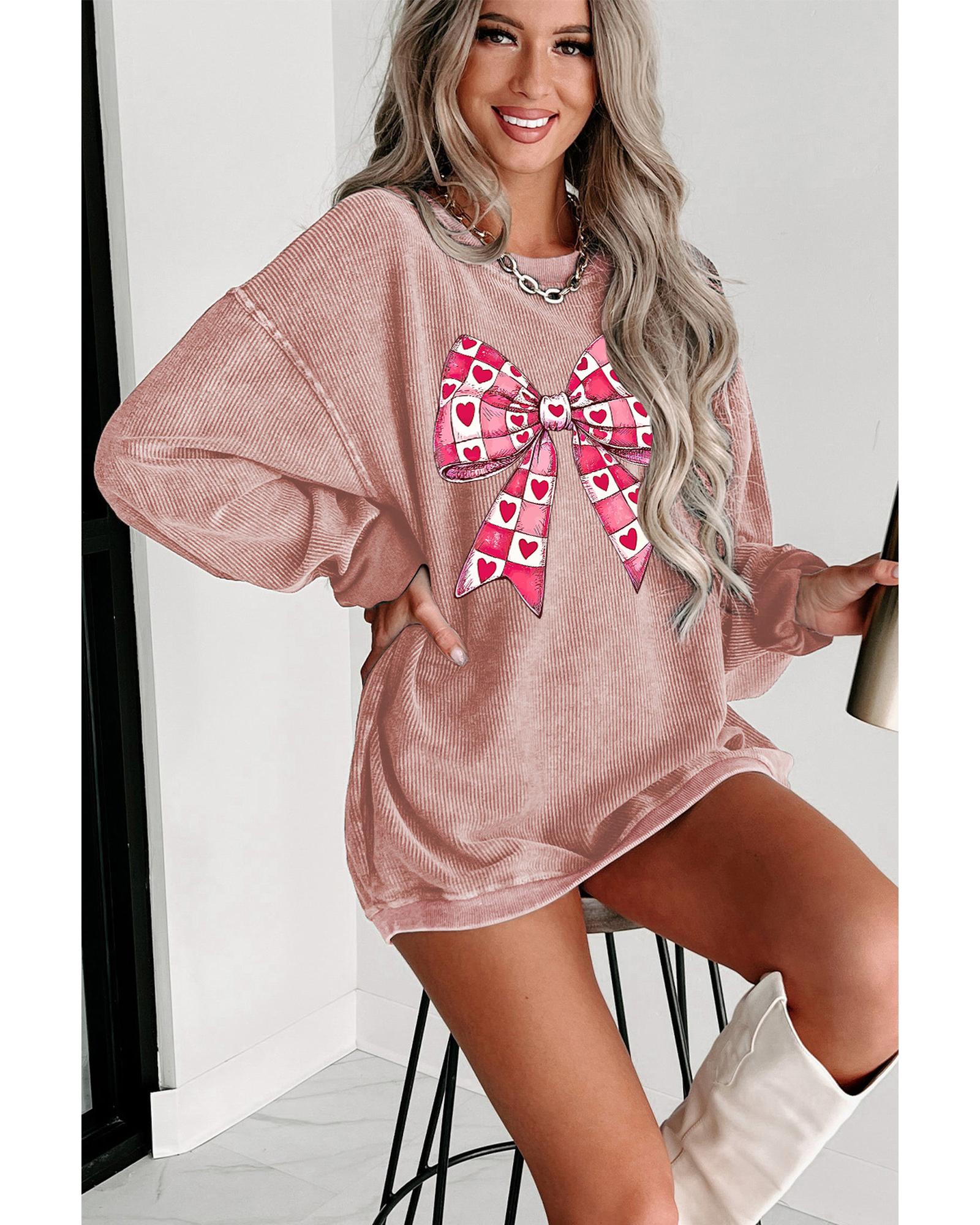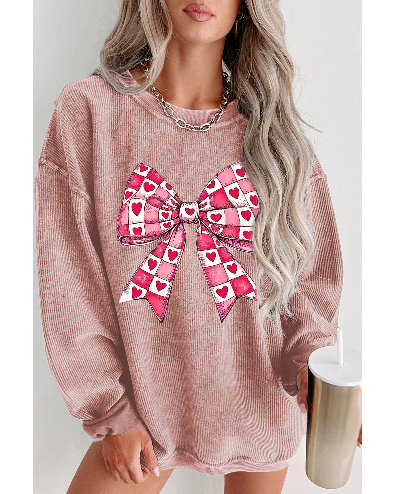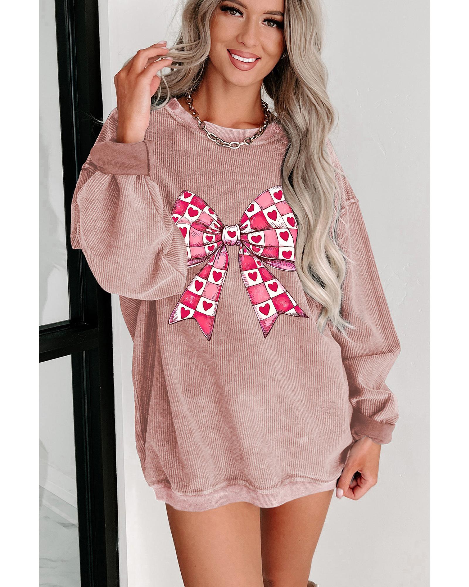 - Pink Valentines Heart Checkered Bow Pattern Corded Baggy Sweatshirt