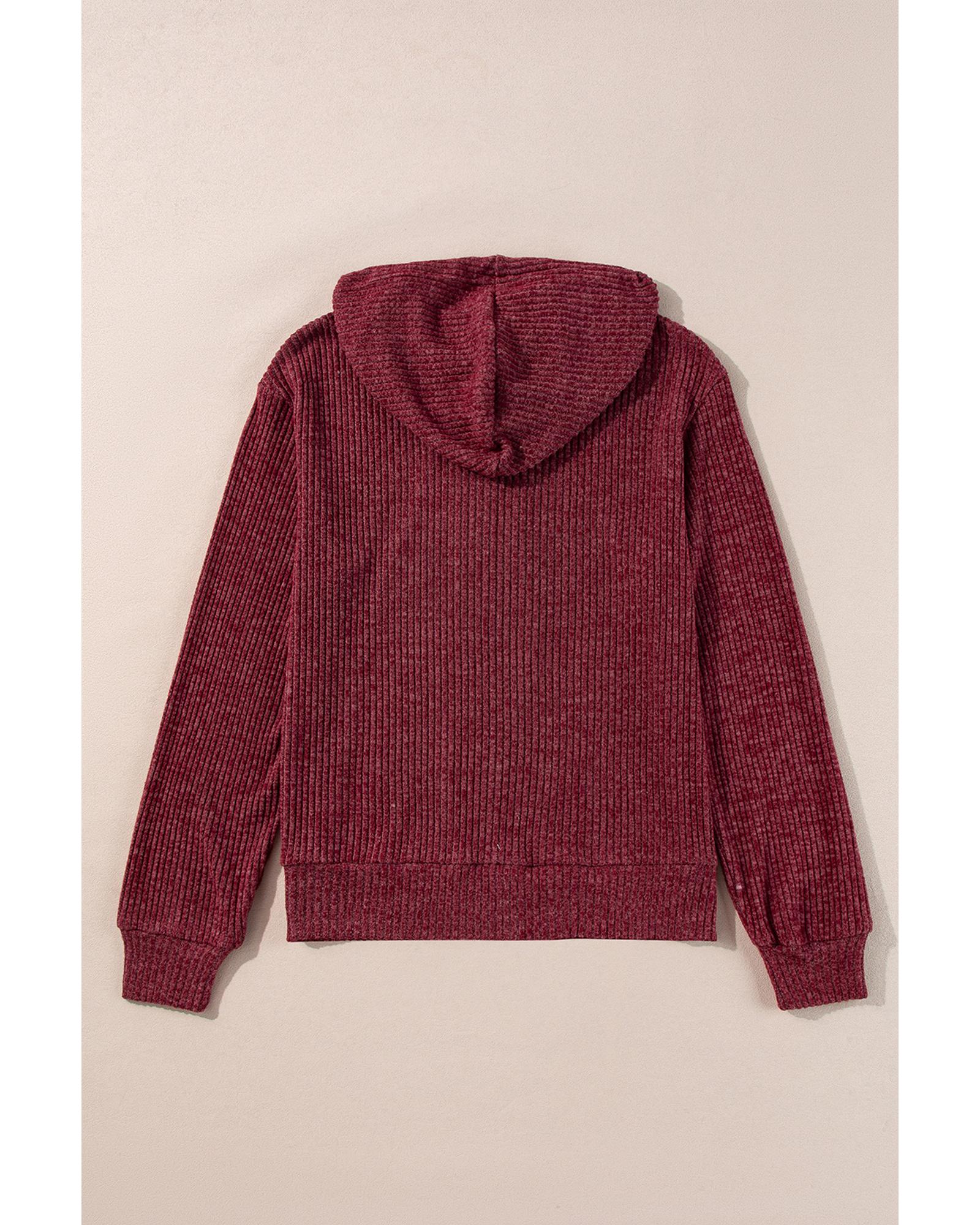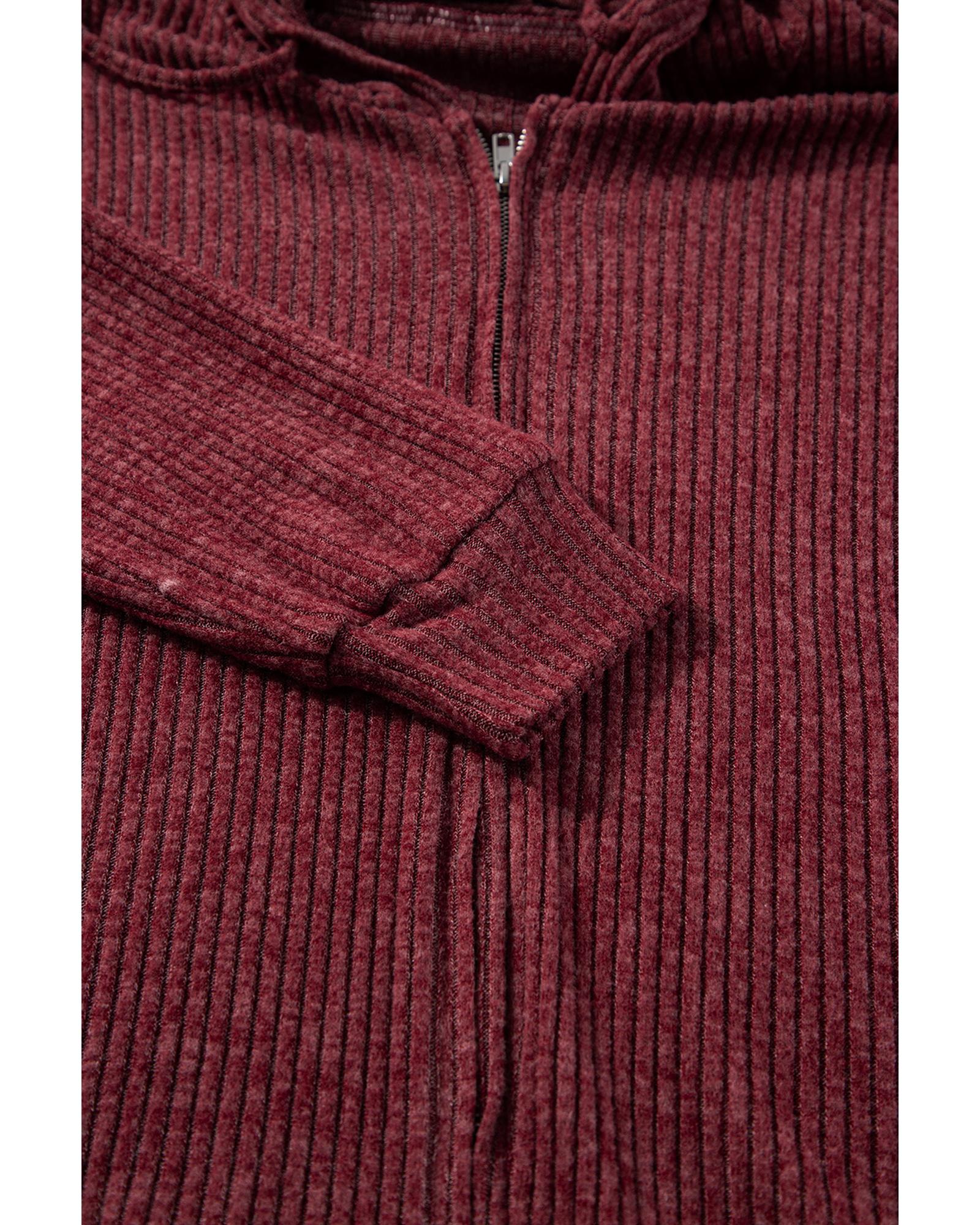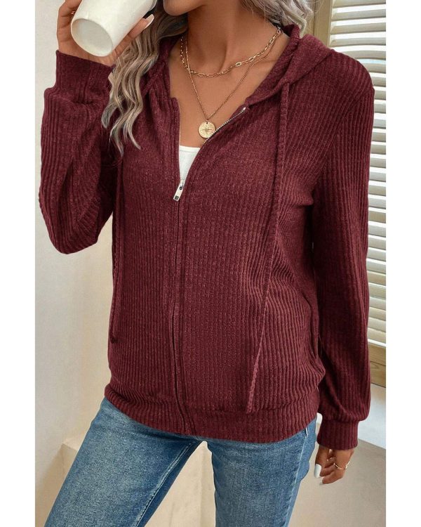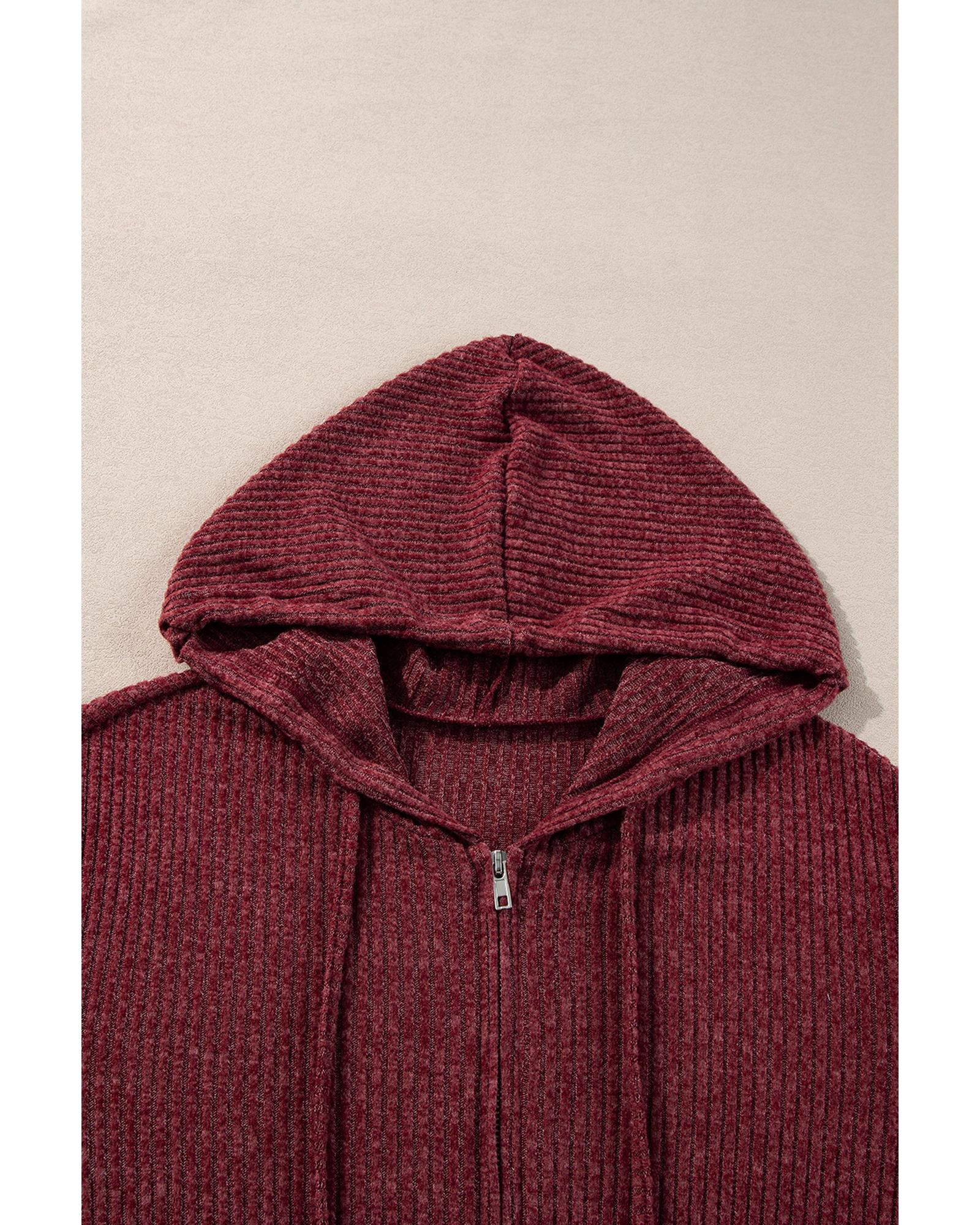 Red Dahlia Ribbed Zip Up Front Drawstring Hoodie