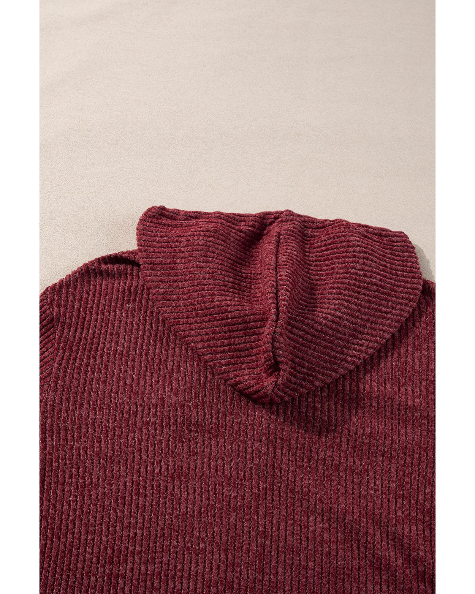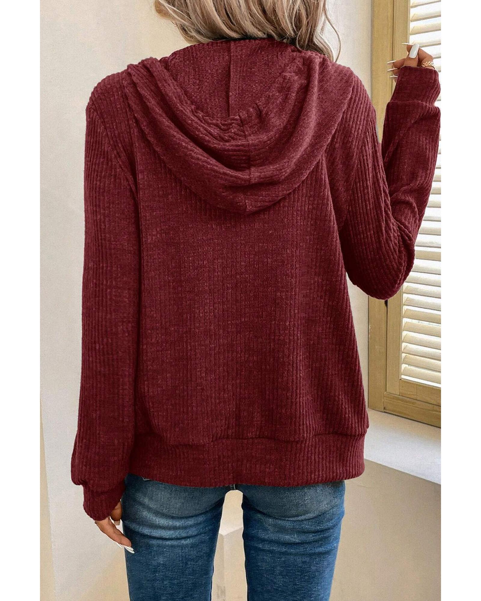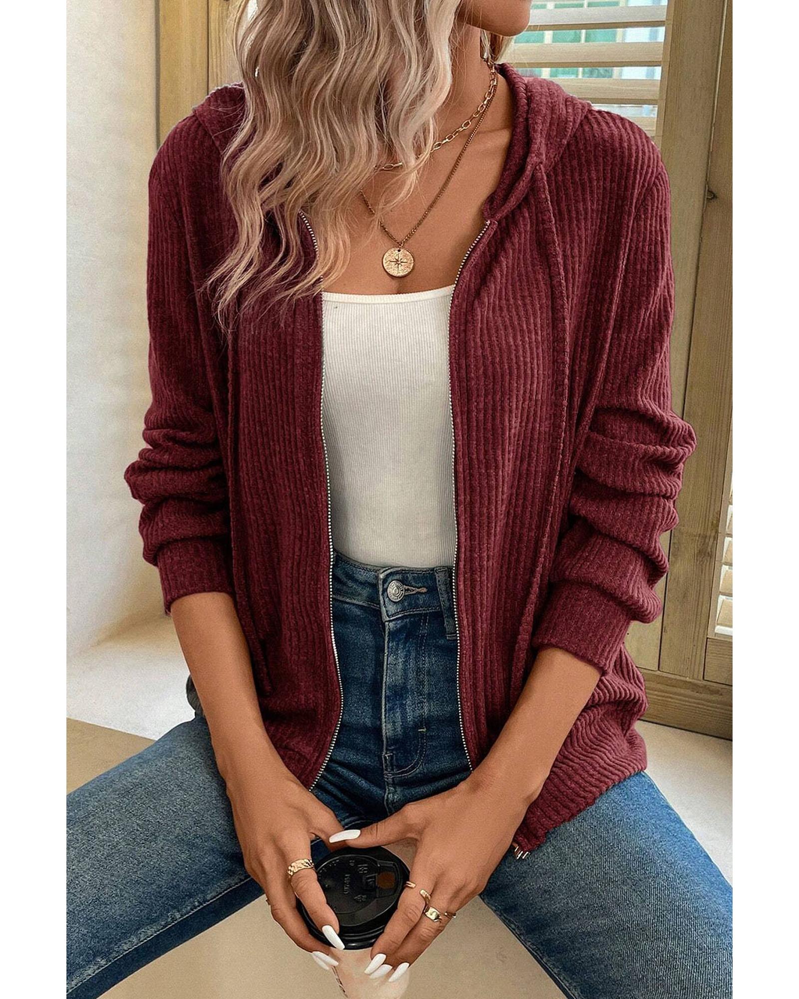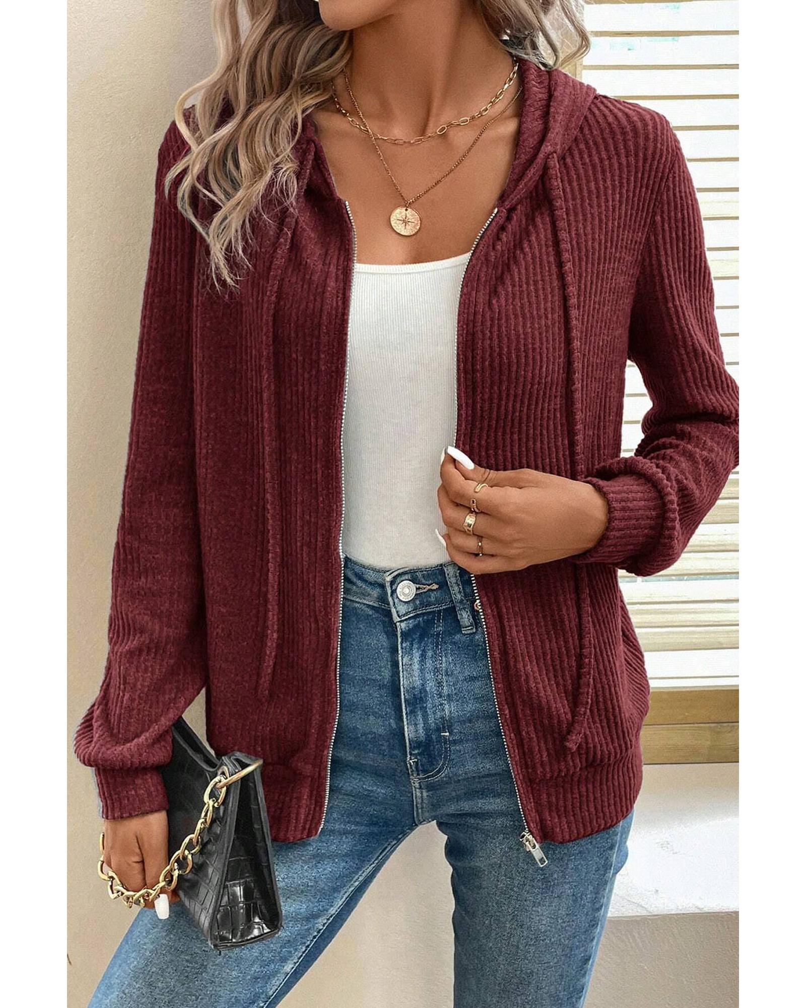 Red Dahlia Ribbed Zip Up Front Drawstring Hoodie