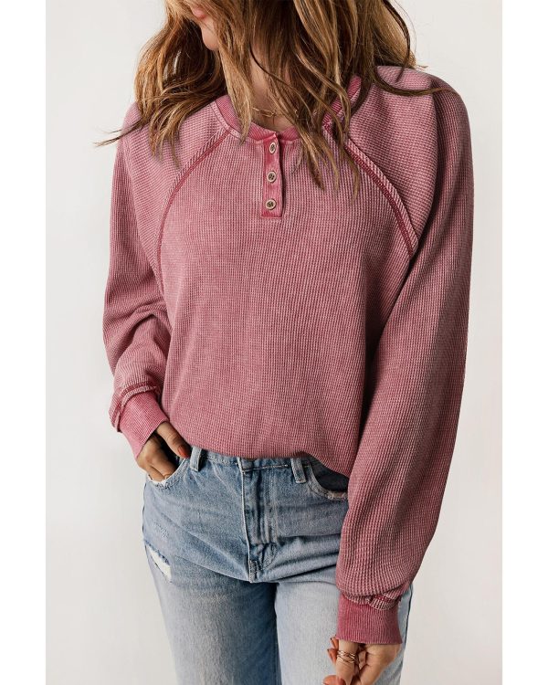 - Red Waffle Knit Raglan Sleeve Henley Sweatshirt