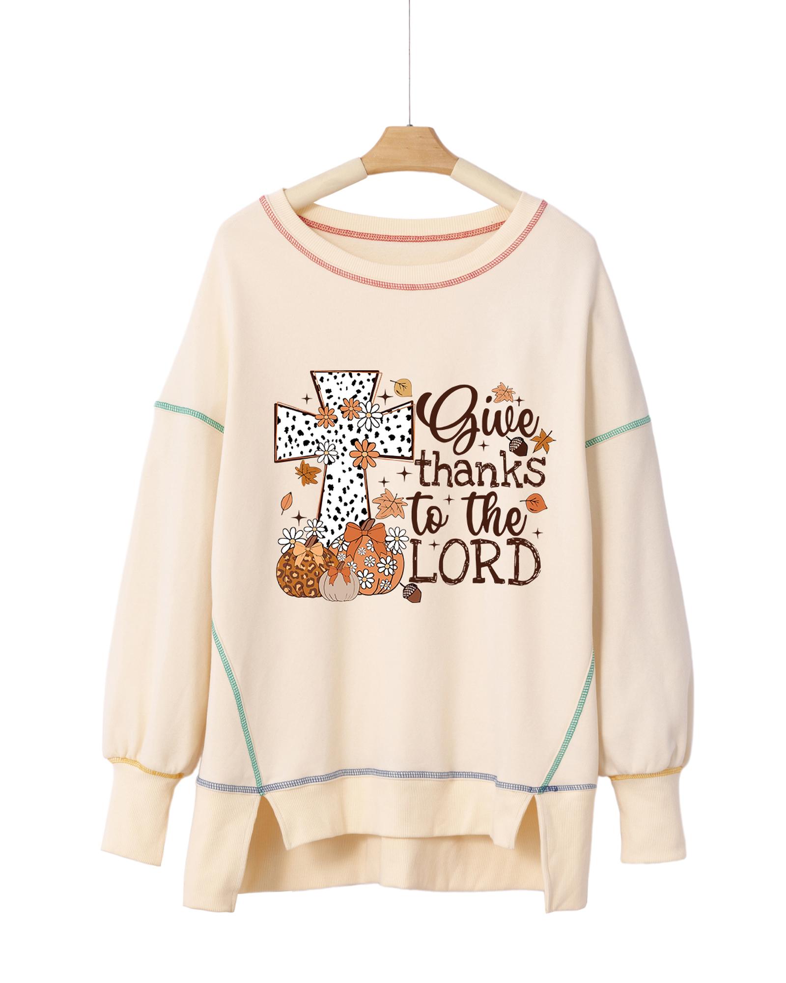 - White sweatshirt with Give Thanks to the LORD graphic design
